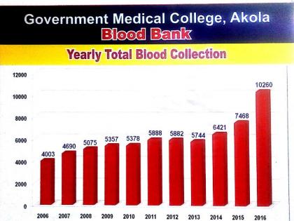 अकोला : पश्चिम विदर्भातील सर्वात मोठे शासकीय रुग्णालय अशी ओळख असलेल्या येथील शासकीय वैद्यकीय महाविद्यालय व सर्वोपचार रुग्णालयाशी संलग्नित असलेल्या रक्तपेढीचा रक्त संकलनाचा आलेख दरवर्षी उंचावत असून, रक्तपेढीने गतवर्षी प्रमाणे यावर्षीही १० हजारपेक्षा अधिक रक्त पिशव्या संकलित करण्याचा टप्पा गाठला आहे. वर्ष २०१७ अखेरपर्यंत रक्तपेढीने तब्बल १००३५ रक्तपिशव्या संकलीत करून नविन विक्रम प्रस्थापित केला आहे.