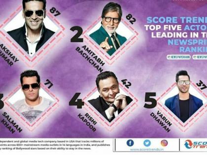 ह्या आकडेवारीनुसार, अक्षय 87 गुणांसह न्यूजप्रिंट श्रेणीमध्ये प्रथम क्रमांकावर राहिला. तर अमिताभ बच्चन 82 गुणांसह दुस-या स्थानावर आणि सलमान खान 71 गुणांसह तिस-या स्थानावर राहिले. अभिनेता ऋषि कपूर चौथ्या स्थानी तर युवापिढीचा लाडका वरुण धवन पाचव्या स्थानी होता.