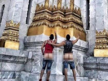 बँकॉक : गेल्या काही वर्षात भटकत्यांची संख्या वाढतेय. जगभर भ्रमंती करून तिकडचा अनुभव फोटो रुपात किंवा शब्दरुपात बंदिस्त करण्याचीही पद्धत वाढतेय. अशीच आवड असलेल्या दोघांना एक जरा वेगळाच छंद होता. हा विचित्र छंद त्यांच्या आता अंगलट आला आहे. थायलंडच्या बुद्ध मंदिराबाहेर नग्न फोटो काढून या व्यक्तींनी इन्स्टाग्रामवर पोस्ट केले. हे फोटो व्हायरल होऊन थायलंडच्या पोलिसांपर्यंत जाऊन पोहोचले आणि थायलंडच्या पोलिसांनी या दोघांना बँगकॉक एअरपोर्टवरून अटक केली.