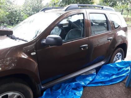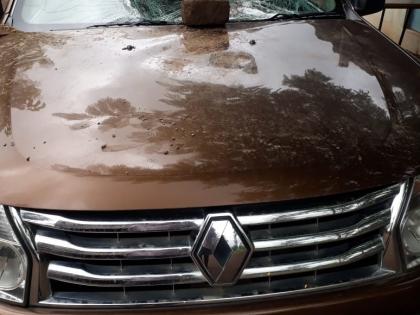 केर्ली (ता. करवीर) येथे सुरु असलेल्या मराठी मालिकेच्या शुटींग दरम्यान हल्लेखोरांनी दगड टाकून फोडलेली कार.