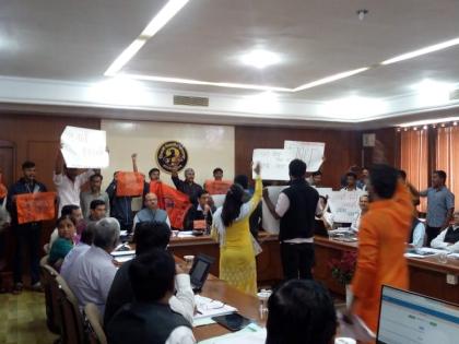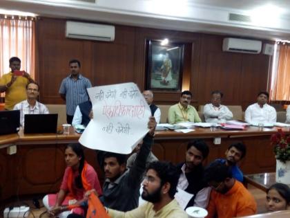 कार्यकर्त्यांनी बैठकीसमोरील जागेत जवळपास दोन तास ठिय्या मारुन या बैठकीत घोषणाबाजी करत आंदोलन केले. यावेळी कार्यकर्त्यांनी कुलगुरु आणि व्यवस्थापन परिषदेच्या सदस्यांना निवेदन देउन लेखी आश्वासन देण्याचा आग्रह धरला. यावेळी कार्यकर्त्यांची घोषणाबाजी सुरुच होती.