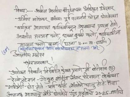दरम्यान, उर्मिला यांनी एएनआय या वृत्तसंस्थेला दिलेल्या मुलाखतीमध्ये हे सर्व आपल्या प्रचारादरम्यान भीती पसरविण्यासाठी केले जात आहे. ही फक्त सुरुवात आहे. पुढे हा प्रकार हिंसक वळण घेईल. माझ्या जीवाला धोका असून पोलिसांकडे संरक्षण पुरविण्याची मागणी केली आहे, असे सांगितले.