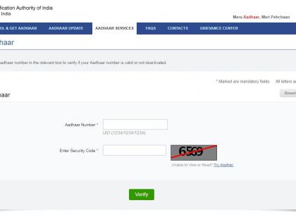 - ही लिंक तुम्हाला नव्या पेजवर घेऊन जाईल. ओपन झालेल्या पेजवर आधार कार्ड नंबरची माहिती मागितली जाईल. आधार कार्डनंबर टाका. तुम्ही एक सुरक्षित कोड टाका आणि व्हेरीफायवर क्लिक करा.