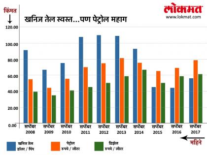 ऑगस्ट 2014 मध्ये पेट्रोलची किंमत प्रतिलीटर 70 रुपयांपेक्षा जास्त होती. त्यावेळी आंतरराष्ट्रीय बाजारात कच्च्या तेलाची किंमत 103.86 डॉलर (जवळपास 6300 रुपये) प्रति बॅरेल होती. देशातील पेट्रोल आणि डिझेलच्या किमती कच्च्या तेलाच्या किमतीवर अवलंबून आहेत. गुरूवारची आंतरराष्ट्रीय बाजारातली कच्च्या तेलाची किंमत 54.16 डॉलर (3470 रुपये) प्रति बॅरेल होती. त्यामुळे सध्याच्या दरानुसार भारतीय पेट्रोलियम कंपन्यांना एक लीटर पेट्रोल अवघ्या 21 रूपयांना मिळतं. त्यावर प्रक्रिया करून वापरण्याजोगं बनवण्यात त्याला 10 रूपये खर्च होतो. म्हणजे सरकारने कोणता टॅक्स आकारला नाही, तर 31 रूपयांमध्ये पेट्रोल मिळू शकतं. पण सध्याच्या करव्यवस्थेत केंद्र सरकारशिवाय राज्य सरकारांकडून पेट्रोल-डिझेलवर व्हॅट आकारला जातो. राजधानी दिल्लीत 27 टक्के व्हॅट तर मुंबईत 47.64 टक्के व्हॅट लागतो. त्यामुळे आपल्याला वेगवेगळ्या राज्यांमध्ये पेट्रोल-डिझेलच्या दरांमध्ये मोठी तफावत पाहायला मिळते.