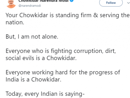 पंतप्रधान नरेंद्र मोदी यांच्या ट्विटर अकाऊंटचे 'चौकीदार नरेंद्र मोदी' असे नवीन नाव ठेवण्यात आलं आहे. त्याचपाठोपाठ भाजपच्या अनेक मंत्र्यांनी मोठ्या नेत्यांनी तसेच भाजप अध्यक्ष अमित शहा यांनी देखील 'चौकीदार अमित शाह' असे नाव ठेवले आहे