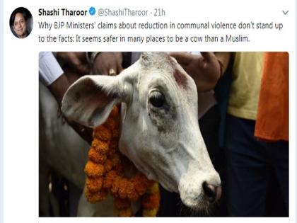 थरुर यांनी असे ट्विट केले आहे की, 'जातीय हिंसाचारात घट होण्याबाबत भाजपा मंत्र्यांकडून करण्यात आलेले दावे वस्तुस्थितीत खरे का उतरत नाहीत. यावरुन असे दिसते की कित्येक ठिकाणी मुस्लिमांच्या तुलनेत गाय सर्वाधिक सुरक्षित आहे.'