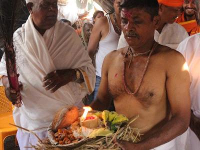 कोल्हापुरातील पंचगंगा नदीघाटावर यात्रेकरूंचा मुक्काम असतो. हे यात्रेकरू श्री जोतिबाची पूजा करत होते. पंचगंगा नदीला नैवेद्य देताना. (छाया : दीपक जाधव )