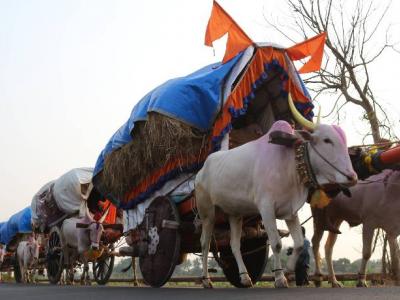 जोतिबा यात्रेसाठी बेळगाव नार्वेकर गली मधील भाविक वडणगे-निगवे मार्गावरून मार्गस्थ झालेल्या बैलगाड्या. (छाया : दीपक जाधव )