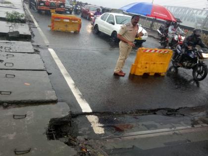 भिवंडी बायपासवरील साकेत ब्रिजला तडे गेल्यामुळे रस्ता खचला