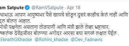 ''नाथाभाऊ आपण आयुष्यभर पैसे खायचे सोडून दुसरं काहीच केलं नाही आणि देवेंद्र भाऊ बद्दल बोलत आहात. विरोधी पक्षनेता असताना तोडपाणी आणि मंत्री झाले तेव्हा भ्रष्टाचार केल्याचा गंभीर आरोप आमदार राम सातपुते यांनी केलाय. तसेच, निष्कलंक देवेंद्र फडणवीसांवर बोलण्या अगोदर आरसा बघा सगळं लक्षात येईल,'' अशी घणाघाती टीका राम सातपुते यांनी एकनाथ खडसेंवर केली आहे. त्यानंतर, एकनाथ खडसेंच्या कन्या रोहिणी खडसे यांनी राम सातपुते यांना प्रत्युत्तर दिलंय.