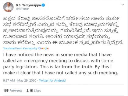 मुख्यमंत्र्यांनी सांगितले की, काही वृत्तवाहिन्यांवर तातडीची बैठक बोलावल्याचे दाखविले जात आहे. मात्र, सत्य त्यापासून खूप लांब आहे. मी अशी कोणतीही बैठक बोलावलेली नाही. मात्र, माझ्या निवासस्थानी रमेश कत्ती यांना भोजनासाठी बोलावले होते. मात्र, याचे राज्यसभा निवडणुकीशी काहीही संबंध नाही, असे त्यांनी ट्विट करून स्पष्ट केले.