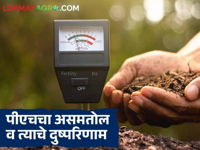 पीएच व त्याचे कमी-अधिक प्रमाण१) पीएच ५.५ पेक्षा कमी असले तर ती माती जास्त आम्लधर्मी होते. ज्यामुळे फॉस्फरस हा लोह व ॲल्युमिनियमच्या बंधनात अडकल्याने पिकांना मिळत नाही. ॲल्युमिनियम, मॅंगनीज घातक ठरतात.२) पीएच ८.० पेक्षा जास्त असेल तर ती माती जास्त अल्कधर्मी होते. ज्यामुळे पिकांना झिंक, लाेह, बोरोन, मॅंगनीज हे अन्नद्रव्ये मिळत नाही. त्यामुळे पिकांची पाने पिवळी पडतात व वाढ खुंटते.३) बिघडलेल्या पीएचमुळे माती जिवंत ठेवणारे जिवाणू मृतवत हाेतात व बुरशी वाढते तसेच नायट्राेजनचे स्थिरीकरण मंदावते.पीएचचा असमताेल व त्याचे दुष्परिणाम१) जमिनीत क्षारांचे प्रमाण अधिक असणे, सिंचनाच्या पाण्याचा अतिवापर करणे किंवा पाण्याची कमतरता भासणे, परस्पर विराेधी खते एकत्र मिसळून देणे, खतांचा अतिवापर, सेंद्रिय पदार्थांची कमतरता, परस्पर विराेधी अन्नद्रव्ये यामुळे पीएचचा असमताेल निर्माण हाेताे.२) क्षारांचे प्रमाण वाढल्यास पाण्याचा याेग्य निचरा हाेत नाही, ऑस्मोटिक दाब वाढतो व झाडांना पाणी व अन्नद्रव्ये शोषणे कठीण जाते.३) पीएच खूप आम्लधर्मी किंवा अल्कधर्मी असल्यास पिकांच्या मुळांना नायट्रोजन, फॉस्फरस, पोटॅशियम हे मुख्य अन्नद्रव्ये मिळत नाही.