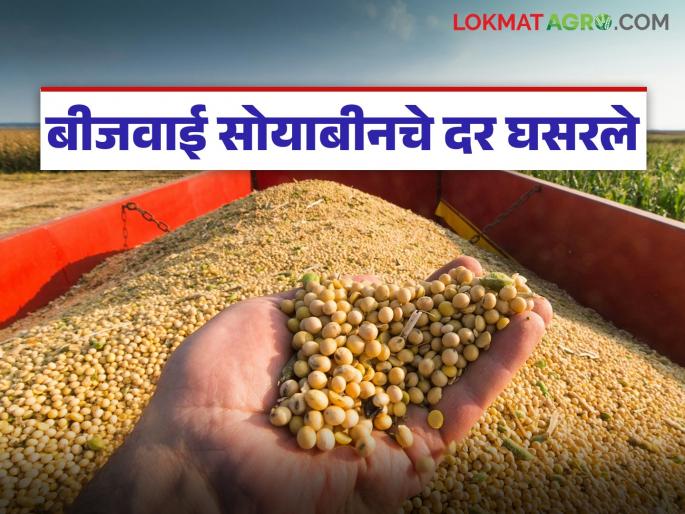 Soybean Seed Market : वाशिम कृषी उत्पन्न बाजार समितीत गेल्या महिनाभरात विक्रमी पातळीवर पोहोचलेले बीजवाई दर्जाच्या सोयाबीनचे दर आता मात्र मोठ्या प्रमाणात घसरले आहेत. (Soybean Seed Market)