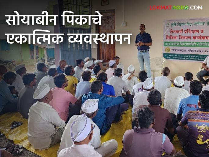 Agriculture News : सद्यस्थितीत सोयाबीन पिकाच्या (Soyabean Crop) लागवडीसाठी शेतकरी तयारी करत आहेत. सोयाबीनच्या बीजप्रक्रियेनंतरच लागवड करण्याचा सल्ला कृषीतज्ञ देत आहेत. अशातच सोयाबीन पिकाचे (Crop Management) एकात्मिक व्यवस्थापन कसे करावे, याबाबत सविस्तर माहिती कृषी विज्ञान केंद्राचे शास्त्रज्ञ रुपेश खेडकर दिली आहे. कृषी विज्ञान केंद्र मालेगाव (KVK Malegaon) तर्फे राष्ट्रीय अन्नसुरक्षा अभियान २०२४-२५ अंतर्गत शेतकऱ्यांना मार्गदर्शन करण्यात आले.