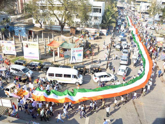 शिर्डी : शिर्डी शहर अभाविपच्या वतीने प्रजासत्ताक दिनानिमित्त तिरंगा पदयात्रा चे आयोजन करण्यात आले. या पदयात्रेमध्ये शेकडो विद्यार्थ्यांसह शहरातील विविध घटक जाती-धर्माच्या भिंती तोडत ४०१ फूटाचा अखंड तिरंगा खांद्यावर घेऊन यात्रेत सहभागी झाले.साईसमाधी शताब्दीच्या पार्श्वभुमीवर समरसतेचा संदेश घेऊन अभाविपने या यात्रेचे आयोजन केले होते. पदयात्रेचे उद्घाटन ज्येष्ठ पत्रकार सुरेश चव्हाणके तसेच माजी विश्वस्त सचिन तांबे, रविंद्र गोंदकर, ग्रीन अँड क्लीन शिर्डीच्या पदाधिका-यांच्या उपस्थीतीत करण्यात आले. शहरातील प्रमुख रस्त्यावरुन ही यात्रा नेण्यात आली. त्यावेळी अनेक ठिकाणी ध्वजावर पुष्पवृष्टी करण्यात आली. यात्रेत साईंनाथ विद्यालय, आदर्श विद्यालय, साईबाबा कन्या विद्यालय, साईबाबा इंग्लिश मीडियम व साईबाबा कनिष्ठ महाविद्यालयाचे विद्यार्थी-विद्याथीर्नी सहभागी झाले होते. सांगता समारंभात अभाविपचे महाराष्ट्र प्रदेश मंत्री अभिजित पाटील यांनी विद्यार्थ्यांना मार्गदर्शन केले.तिरंगा पदयात्रेत शुभम अग्रवाल, सम्राट माळवदकर, चेतन कोते, योगेश जपे, अक्षय गोंदकर, अक्षय महाजन, नेहा दंडवते, मयूर चोळके, अक्षय आल्हाट, महेंद्र उगले, शिवानी चव्हाण, अश्विन पवार, आदित्य ठाकूर, भावीन जोशी, आकाश कोडीतकर, मनीषा तलरेजा, अनाम तांबोळी, सानिया शेख, चैताली रहाणे आदींसह भाजपाचे शिवाजी गोंदकर, किरण बो-हाडे, गजानन शेर्वेकर, तुकाराम गोंदकर,सचिन शिंदे, नगरसेविका वंदना राजेंद्र गोेंदकर आदी पदाधिकारीही मोठ्या संख्येने उपस्थीत होते.