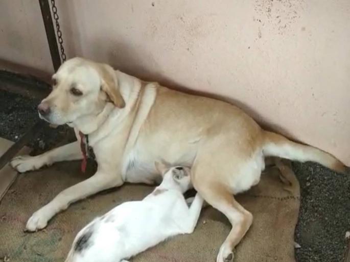 जन्म झाल्यानंतर आई गमावणाऱ्या मांजरीच्या पिल्लाची कुत्री घेतेय काळजी