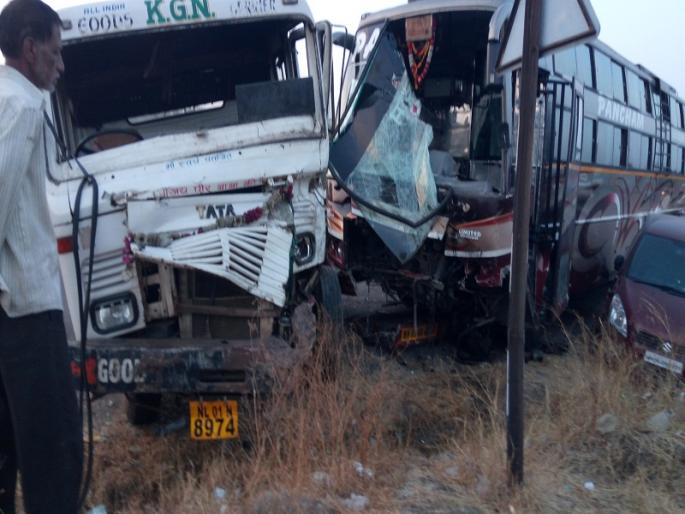 नेवासा : अहमदनगर - औरंगाबाद महामार्गावर घोडेगावजवळ तीन वाहनांचा विचित्र अपघात झाला. लोखंडी अँगल घेऊन जाणारा ट्रेलर दुभाजकावर चढल्याने रस्त्यावरच पलटी झाला. या ट्रेलरने आराम बसला धडक दिली. त्याच आराम बसला कार धडकली. सुदैवाने यामध्ये जिवितहानी झाली नाही. हा अपघात आज पहाटे झाला.औरंगाबादकडून नगरकडे लोखंडी अँगल घेऊन ट्रेलर निघाला होता. पहाटे ५ वाजण्याच्या सुमारास चालकाला डुलकी लागल्याने तो दुभाजकावर चढला. नगरकडून जालन्याकडे जाणा-या आराम बसला ट्रेलर धडकला. आराम बसच्या चालकाने प्रसंगावधान राखत बसवर नियंत्रण मिळविल्याने जीवित हानी टळली. याच आराम बसला नगरवरून औरंगाबादकडे जाणारी कार धडकली. तीन वाहनांच्या या विचित्र अपघातात ट्रेलर पलटी झाला. वाहनांचे नुकसान झाल असले तरी सुदैवाने कुठलीही जीवितहानी झाली नाही.सोनई पोलीस ठाण्याचे पोलीस कर्मचारी किरण गायकवाड अपघात स्थळी दाखल झाले. अपघातामुळे दोन्ही बाजूला जवळपास १ किलोमीटर अंतरावर वाहनांच्या रांगा लागल्या होत्या. ट्रेलर बाजूला काढण्यात आल्यानंतर वाहतूक सुरळीत झाली .