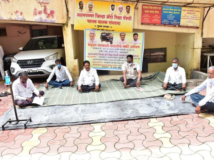 अहमदनगर जिल्हा ऑटो रिक्षा व टॅक्सी चालक-मालक संघटनेच्या वतीने मार्केटयार्ड हमाल भवन येथे साखळी पद्धतीने सोशल डिस्टंसिंग ठेवून कायदेशीर नियमाचे पालन करून बेमुदत उपोषण चालू करण्यात आले.
