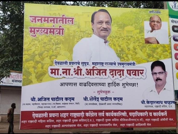 देवळाली प्रवरा (जि. अहमदनगर) : उपमुख्यमंत्री अजित पवार यांचे आजोळ असलेल्या राहुरी तालुक्यातील देवळाली प्रवरा येथील मुख्य चौकात अजित पवारांच्या वाढदिवसानिमित्त बॅनर लावण्यात आला असून या बॅनरवर अजित पवारांचा 'जनमनातील मुख्यमंत्री' असा उल्लेख करण्यात आला आहे. त्यामुळे राजकीय वर्तुळाच चर्चांना उधाण आले आहे.