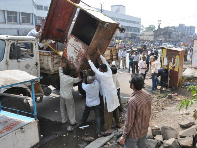 जवळपास महिनाभरानंतर महापालिकेच्यावतीने अतिक्रमण हटाव मोहिम राबविण्यात आली. पहिल्या टप्प्यात नगर-पुणे महामार्ग व रेल्वेस्टेशनपर्यंतची अतिक्रमणे हटविली जाणार आहेत. त्यानुसार मंगळवारी इम्पीरिअल चौक ते मार्केट यार्ड चौकादरम्यानची अतिक्रमणे हटविण्यात आली आहेत. इम्पीरिअल चौक ते मार्केट यार्ड चौक हा अतिक्रमणांच्या विळख्यात अडकला होता. टपरीधारकांनी थेट महामार्गावरच टप-या मांडल्या होत्या. अतिक्रमणविरोधी पथकाने या टप-या मंगळवारी हटविल्या.
