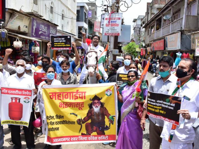 अहमदनगर शहरात काँग्रेसचा मोर्चा; घोड्यावर बसून पेट्रोल डिझेल दरवाढीचा निषेध