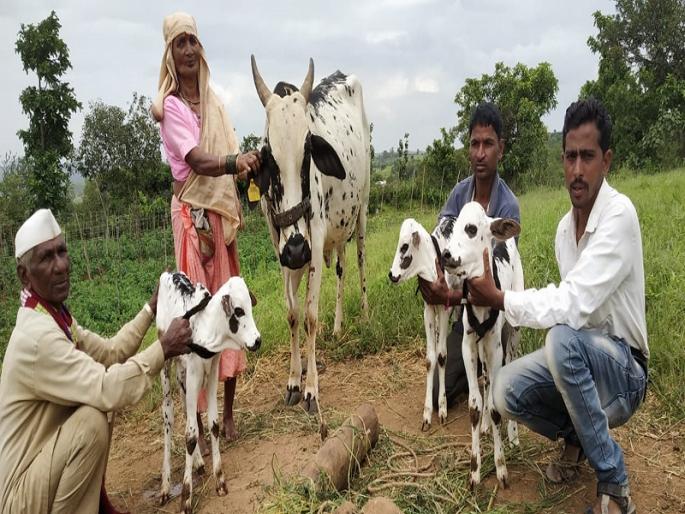राजूर : अकोले तालुक्यातील जायनावाडी येथील काळू लिंबा भांगरे या आदिवासी शेतक-याच्या डांगी गायीने तीन वासरांना जन्म दिला. विशेष म्हणजे ही तिनही वासरे धडधाकट आहेत. याबाबतची माहिती अशी, काळू भांगरे यांनी आपल्या डांगी जातीच्या गायीस कृत्रीम पध्दतीने रेतन केले होते. पशुधन पर्यवेक्षक सुनील सदगीर यांनी हे कृत्रीम रेतन केले होते. गर्भधारणा वाढीस लागल्यानंतर डॉ. सदगीर वेळोवेळी या गायीची तपासणी करत होते. दिवस पूर्ण झाल्यानंतर या डांगी जातीच्या गायीने तीन वासरांना नैसर्गिकरित्या जन्म दिला. आजपर्यंत गायीने जुळ्या वासरांना जन्म दिल्याच्या घटना घडल्या आहेत, मात्र तीन वासरांना जन्म देण्याची ही तालुक्यातील पहिलीच घटना असल्याने परिसरात हा चर्चेचा विषय ठरला आहे. गाय दोन्ही वेळेस एकूण पाच लिटर दूध देत असल्याचे सांगत जन्माला आलेल्या तिन्ही वासरांची चांगली वाढ होईल. आमच्या भागात गायीला तिळे होण्याची ही पहिलीच वेळ असल्याचे त्यांनी सांगितले.‘‘गायीला तिळे होणे ही लाखातील एखादी घटना असते. त्यातही डांगी जातीच्या वळूचे गोठीत वीर्य यासाठी वापरण्यात आले होते. तीनही वासरांचे रक्ताचे नमुने घेण्यात येणार असून या वळूच्या कृत्रीम रेतनाचा नमुना घेऊन त्यांची डी.एन. ए. तपासण्यात येणार आहेत. यामुळे डांगी जातीचे संवर्धन करणे महत्त्वाचे ठरणार असल्याचे’’ मत तालुका पशुधन विकास अधिकारी डॉ संतोष वाकचौरे यांनी दिली.