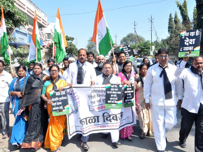 अहमदनगर: सरकारच्या नोटाबंदीविरोधातकाँग्रेस- राष्ट्रवादीच्या वतीने ठिकठिकाणी निदर्शने करण्यात आली. ‘नोटाशेठ’चे श्राध्द घालून डाव्यांनी सरकारचा निषेध केला. भाजपाने शहरातून मोटारसायकल रॅली काढून काळ्या पैशाविरोधात जनजागृती केली. राजकीय पक्षांसह विविध संघटनांनी केलेल्या आंदोलनांनी बुधवारी नोटाबंदीवरून शहरासह जिल्ह्यात पुन्हा राजकीय खडखडाट झाला.केंद्र सरकारच्या पाचशे व हजार रुपयांच्या नोटा चलनातून बाद केल्याच्या निर्णयाला बुधवारी एक वर्ष पूर्ण झाले. नोटाबंदीच्या वर्षपूर्तीनिमित्त राष्ट्रवादी काँग्रेसच्या वतीने जिल्हाधिकारी कार्यालयासमोर जोरदार निदर्शने करत गाजर दाखवून सरकारचा निषेध करण्यात आला. शहरात काँग्रेसच्या वतीने येथील हुतात्मास्मारक येथे निदर्शने करत काळा दिवस पाळण्यात आला. शेतकरी संघटना, विडी कामगार आणि प्रहार संघटनेच्या वतीने जिल्हाधिकारी कार्यालयासमोर ‘नोटाशेठ’च्या श्राध्दाचा विधी करण्यात आला. काँग्रेसचे माजी नगरसेवक निखील वारे यांच्या नेतृत्वाखाली सावेडी उपनगरातील एकविरा चौकात मेणबत्त्या पेटवून नोटाबंदीच्या काळात मृत पावलेल्यांना श्रध्दांजली अर्पण करण्यात आली. तसेच राष्ट्रवादी काँग्रेसच्या वतीने जिल्ह्यातील तहसील कार्यालयासमोर धरणे, निदर्शने करत सरकारचा निषेध करण्यात आला.