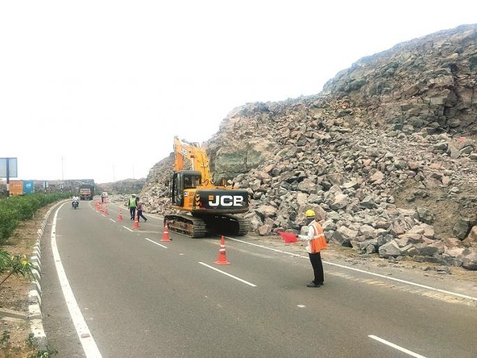 घारगाव : संगमनेर तालुक्याच्या पठार भागातील पुणे-नाशिक राष्ट्रीय महामार्गाच्या कडेला असलेल्या डोंगर टेकड्यांवरील धोकादायक दगड काढण्याचे काम सुरु आहे. हे काम सुरू असताना एक मोठा दगड थेट महामार्गाच्या मध्यावर आला. सुदैवाने यामुळे होणारा अपघात टळल्याची घटना शनिवारी सकाळी अकराच्या सुमारास कुरकुंडी शिवारात घडली.कुरकुंडी परिसरात सुरु असलेल्या कामाच्या दरम्यान एक मोठा दगड अचानक रस्त्याच्या मध्यापर्यंत आल्याने, कामगारांची तारांबळ उडाली. सुदैवाने त्यावेळी या ठिकाणी एखादे वाहन नसल्याने संभाव्य अपघात टळला. महामार्गाशी संबंधीत अनेक कामे ठेकेदाराने अपूर्ण ठेवल्याने, या मार्गावर वारंवार अपघात होण्याचे प्रमाण वाढले आहे. पठार भागातील चंदनापुरी घाट, कुरकुंडी परिसर व एकल घाटातील धोकादायक वळण या ठिकाणी उभा डोंगर तासून रस्ता बनविण्यात आला आहे. पावसाळ्यात या परिसरात लहान मोठ्या दरडी कोसळण्याच्या शक्यतेमुळे महामार्ग व्यवस्थापनाने अनेक धोकादायक ठिकाणी लोखंडी जाळ्या लावल्या आहेत. तरीही काही ठिकाणी असलेले मोठे धोकेदायक दगड जेसीबीने फोडून काढण्याचे काम गेल्या चार-पाच दिवसांपासून सुरु आहे. यासाठी रस्त्याच्यामध्ये बॅरिकेट टाकून एकेरी मार्गाचा वापर सुरु आहे.अनेक कामे प्रलंबितगेल्या महिन्यात या परिसरात झालेल्या आंदोलनाच्या पार्श्वभूमीवर महामार्ग प्रशासकीय अधिकाऱ्यांची प्रांताधिकारी भागवत डोईफोडे, तहसिलदार साहेबराव सोनवणे, उपविभागीय पोलीस अधिकारी अशोक थोरात, जिल्हा परिषद सदस्य अजय फटांगरे यांच्या उपस्थितीत झालेल्या बैठकीत, महामार्गाशी संबंधित सर्व प्रलंबित कामे तातडीने करण्याचे ठरले होते. बोटा, साकुर फाटा येथील सर्व्हिसरोड, दिशादर्शक फलक, गतीरोधक अशी कामे अद्यापही प्रलंबित आहेत.