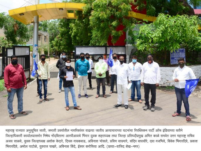 अहमदनगर- महाराष्ट्र राज्यात अनुसूचित जाती, जमाती प्रवर्गातील नागरिकांवर वाढत्या जातीय अत्याचाराच्या घटनांचा रिपब्लिकन पार्टी ऑफ इंडियाच्या वतीने जिल्हाधिकारी कार्यालयासमोर निषेध नोंदविण्यात आला. तर राज्यातील वाढत्या जातीय अत्याचाराच्या घटना रोखण्यासाठी विशेष मोहीम हाती घेण्याची मागणी करण्यात आली.