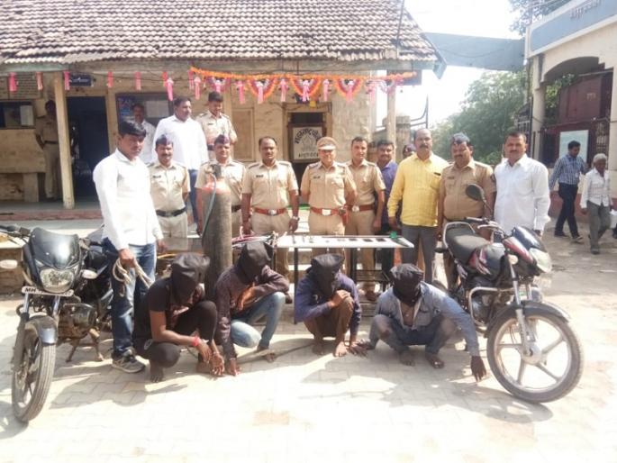 राहुरी येथील गोकुळ कॉलनीमध्ये दरोडा घालण्यासाठी सहा जण काटेरी झुडुपांच्या मागे लपून बसल्याची माहिती पोलिसांना मिळाली होती. घटनास्थळी पोलीस आल्याचे पाहताच दरोडेखोरांनी पथकावर दगडाचा मारा सुरू केला. दगडाचा मारा सुरू झाल्यानंतर पोलिसांनी भिंतीचा आधार घेतला़. त्यानंतर पोलिसांनी गोळीबार करण्याचा निर्णय घेण्यापूर्वीच एकास पकडले. त्यानंतर पाठलाग करुन अन्य तिघांनाही जेरबंद केले. पकडलेल्या दरोडेखोरांकडून पोलिसांनी गॅसकटर, गॅस टाकी, कटावणी, कात्री व दोन मोटारसायकलसहअन्य साहित्य जप्त केले आहे. दरोडेखोर हे सराईत गुन्हेगार आहेत. ते संगमनेर, श्रीरामपूर आदी भागातील असल्याचे समोर आले आहे. सागर गोरख मांजरे (रा.पाईपलाईन रोड, अहमनगर),अविनाश अजित नागपुरे (रा. भिंगार, ता़नगर), गणेश मारूती गायकवाड (रा. उक्कलगाव, ता़श्रीरामपूर) असे पकडलेल्या दरोडेखोरांची नावे आहेत.