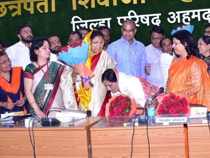 अहमदनगर: जिल्हा परिषदेच्या अध्यक्षपदी निवड झाल्यानंतर राजश्री घुले यांनी सर्व सभागृहाला अभिवादन करत सहकार्याची विनंती केली़ त्यानंतर माजी अध्यक्षा शालिनी विखे यांचे चरणस्पर्श करीत घुले यांनी शालिनतेचे दर्शन घडविले़ तसेच ताई आपला आशीर्वाद असू द्या, असे आर्जव केले़