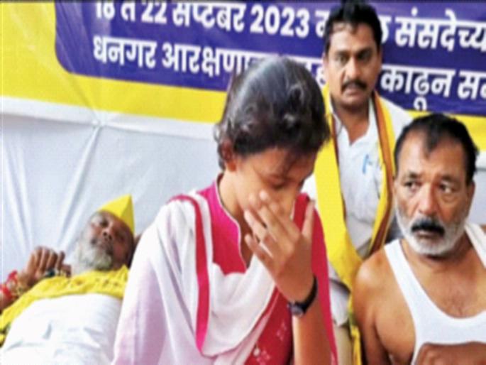 लोकमत न्यूज नेटवर्कजामखेड (जि. अहमदनगर) : धनगर समाज आरक्षणासाठी चोंडी येथे गेल्या १९ दिवसांपासून उपोषण सुरू आहे. येथील प्रकृती खालावलेले उपोषणकर्ते सुरेश बंडगर यांच्या मुलीने रविवारी दुपारी उपोषणस्थळी भेट दिली. वडिलांची अवस्था पाहून तिला अश्रू अनावर झाले. सरकारने आरक्षणाचा प्रश्न मार्गी लावावा, अशी मागणी तिने केली.