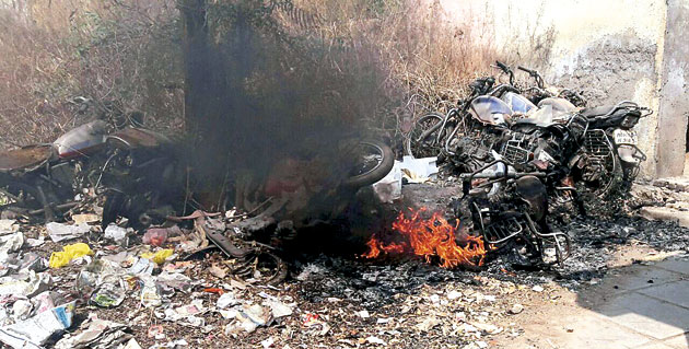 लोकमत न्यूज नेटवर्कजामखेड : तहसील कार्यालयाच्या मागे विविध गुन्ह्यातील जप्त केलेल्या पाच ते सहा मोटरसायकलींना मंगळवारी अचानक आग लागून खाक झाल्या. जामखेड नगरपरिषदेच्या अग्निशमन बंबाने तातडीने आग आटोक्यात आणल्याने पुढील अनर्थ टळला. यापूर्वी दोन वर्षापूर्वी देखील येथील १७ गाड्यांना आग लागली होती. जामखेड तहसिल कार्यालय व जामखेड पोलीस स्टेशन हे एकाच आवारात होते. यामुळे अनेक वर्षांपासून विविध गुन्ह्यासंबंधी जवळपास पन्नास ते साठ दुचाकी गाड्या या अवारातील तहसील कार्यालयाच्या पाठीमागे जामखेड पोलिसांनी ठेवलेल्या होत्या. त्यापैकी काही गाड्या नवीन पोलीस ठाण्याच्या आवारात ठेवण्यात आल्या तर काही दोन चाकी गाड्या अनेक वर्षांपासून जुने तहसील कार्यालयात पडून आहेत. त्यांच्यावर गंज चढून त्या खराब झाल्या आहेत. आता तहसील कार्यालय व पोलीस स्टेशन जवळच काही अंतरावर नवीन जागेत स्थलांतर झाले आहे. त्यामुळे याकडे तहसील व पोलीस प्रशासनाचे दुर्लक्ष झाले आहे. १२ मार्च रोजी दुपारी दोन वाजण्याच्या सुमारास तहसील कार्यालयाच्या पाठीमागे अचानक धूर निघत असल्याचे निलेश शिंदे, दत्ता घुमरे या युवकांच्या लक्षात आले. त्यानंतर त्यांनी प्रभारी तहसीलदार विजय भंडारी यांना सदर माहिती दिली. भंडारी यांनी तातडीने जामखेड नगरपरिषदेच्या अग्निशमन बंबाला माहिती दिली. बंब तातडीने दाखल झाल्याने इतर वाहने वाचली. परंतु पाच ते सहा मोटारसायकली जळून खाक झाल्या....रेकॉर्ड रुमचे नुकसान टळलेतहसील व पोलीस स्टेशन परिसरात संपूर्ण तालुक्याचे महत्वाचे दस्त ऐवज (रेकॉर्ड) रूम व संपूर्ण तालुक्याची सात-बारा व आठ ‘अ’ चे नोंदी असलेली संगणक रूमही जवळच होती. सुदैवाने या दोन्ही खोल्यांचे नुकसान झाले नाही. या ठिकाणी स्वच्छतागृह असल्याने अनेक लोक लघुशंकेसाठी जातात. यामुळे अज्ञात व्यक्तीने धुम्रपान करून सिगारेट ओढून टाकली किंवा शेजारी असलेला कचरा पेटविल्याने ही आग लागली असल्याचा अंदाज वर्तविला जात आहे. मात्र अद्याप आगीचे कारण समजू शकले नाही. जामखेडमध्ये भंगारमधील दुचाकी गाड्यांना आग