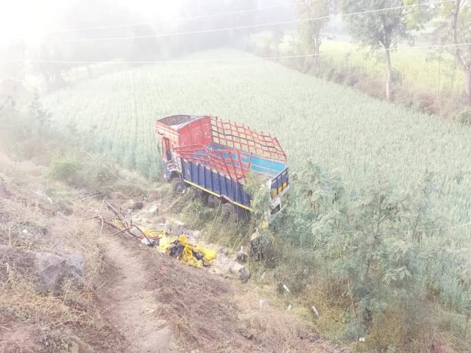 मालवाहू ट्रक (क्रमांक एम.एच.-१२, सी.टी.०१८८) गव्हाच्या गोण्या घेऊन साकुर येथून सातारा या ठिकाणी जात होता. शनिवारी रात्री ट्रक नऊ वाजेच्या दरम्यान साकुर फाटा येथे आला असता नाशिक-पुणे महामार्गालगतच्या उपरस्त्यांवरील पडलेल्या खड्ड्यांमुळे ट्रक चालकाला अंदाज न आल्याने ट्रक लगतच्या चाळीस फूट खोल शेतात उलटला. सुदैवाने चालक बचावला. मात्र, गव्हाच्या गोण्या फुटल्याने गव्हाचे नुकसान झाले.