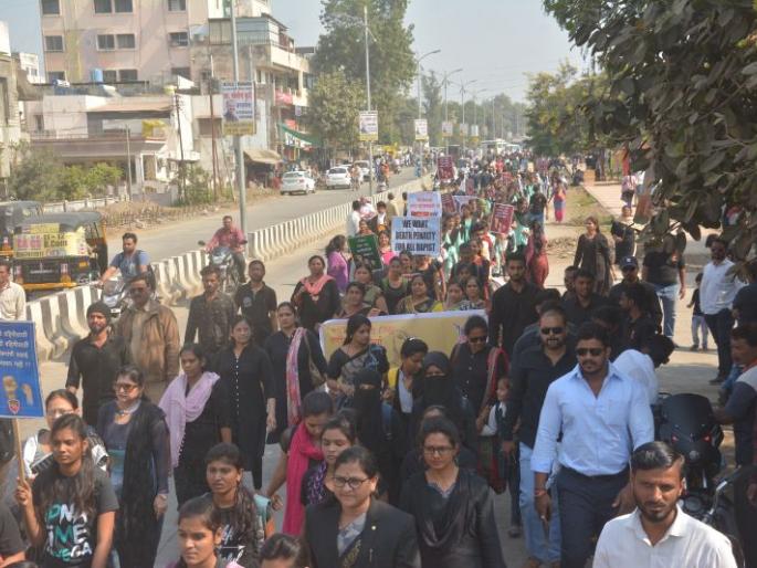 लोकमत न्यूज नेटवर्कअकोला : देशभरात महिलांवर वाढते अत्याचार, कायद्याची संथ अंमलबजावणी, लैंगिक शोषणासारख्या अत्याचाराविरोधात शनिवारी अकोलेकरांचा निषेध मोर्चा जिल्हाधिकारी कार्यालयावर धडकला. निषेध मोर्चामध्ये महाविद्यालयीन विद्यार्थिनी, महिलांसोबतच शेकडो नागरिकांनी सहभाग घेतला.देशभरात महिलांवर लैंगिक अत्याचारासोबतच त्यांच्या हत्येचे प्रमाण वाढले आहे. अशा प्रकरणात कायद्याची अंमलबजावणी अतिशय संथ गतीने होत असल्याने आरोपींमध्ये कायद्याचा धाक राहिला नाही. याविरोधात अकोलेकरांनी शनिवारी जिल्हाधिकारी कार्यालयावर निषेध मोर्चा काढला. अशोक वाटिका येथून काढण्यात आलेल्या निषेध मोर्चात शहरातील महिलांसह शिवाजी महाविद्यालयातील विद्यार्थी, विद्यार्थिनी, आयटीआयच्या (मुली) विद्यार्थिनी, तसेच विविध संस्था, संघटना मोठ्या संख्येने सहभागी झाले. हा मोर्चा शासकीय वैद्यकीय महाविद्यालय मार्गे जिल्हाधिकारी कार्यालय परिसरात पोहोचला. या ठिकाणी मोर्चात सहभागी महिला व विद्यार्थिनींनी महिलांवर होत असलेल्या अत्याचाराविरोधात निषेध व्यक्त करीत कठोर कायदे अन् त्यांच्या प्रभावी अंमलबजावणीची मागणी केली. हैदराबाद खटल्यातील आरोपी जरी मारल्या गेलेत, तरी त्यामुळे असे अमानवी कृत्य थांबणार नाहीत. दिल्लीतील निर्भया, उन्नाव, राजस्थान, कोपर्डी प्रकरणातील आरोपींना अजूनही न्याय मिळाला नाही. या घटनांतील आरोपींना तातडीने शिक्षा व्हावी, यासह विविध मागण्या यावेळी करण्यात आल्यात. मोर्चा जिल्हाधिकारी कार्यालय परिसरात पोहोचल्यावर उपजिल्हाधिकारी प्रा. संजय खडसे यांनी मोर्चाला भेट देऊन विद्यार्थिनींसोबत चर्चा केली. यावेळी विद्यार्थिनींनी विविध मागण्यांचे निवेदन त्यांना दिले.जिल्हाभरात राबविले स्वाक्षरी अभियानमहिलांवरील अत्याचारातील आरोपींना त्वरित शिक्षा आणि आपत्कालीन स्थितीत महिलांना तत्काळ मदतीसाठी पोलीस यंत्रणा उभी करावी, या मागणीसाठी शहरासह जिल्ह्यातील विविध भागात ४ डिसेंबरपासून स्वाक्षरी अभियान राबविण्यात आले. शनिवारी जिल्हाधिकारी कार्यालयावर काढण्यात आलेल्या मोर्चात सहभागी विद्यार्थी व महिलांनी स्वाक्षरी करून महिलांवर होणाऱ्या अत्याचाराचा निषेध केला.