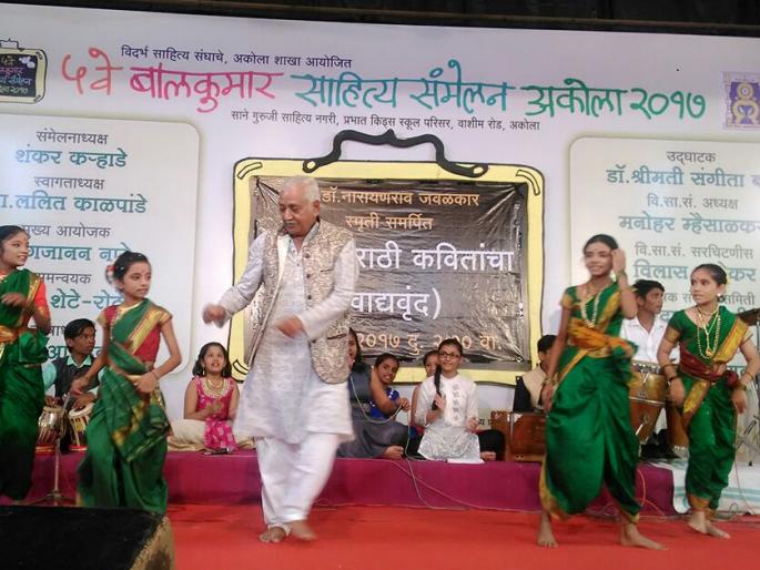 अकोला : येथील प्रभात किड्स स्कुल शाळेच्या प्रांगणात सुरु असलेल्या पाचव्या राज्यस्तरीय बालकुमार साहित्य संमेलन सुरु आहे. शनिवारी या संमेलनाच्या दुसºया दिवशी दुपारच्या सत्रात जागर मराठी कवितांचा या कार्यक्रमात सुप्रसिद्ध वºहाडी कवी विठ्ठल वाघ यांची ‘काळ्या मातीत मातीत, तिफन चालते’ ही कविता सादर करण्यात आली. यावेळी तेथे उपस्थित असलेले कवी विठ्ठल वाघ यांना कवितेच्या तालावर फेर धरण्याचा मोह आवरला नाही. कविता सुरु असताना विठ्ठल वाघ मंचावर आले आणि चिमुकल्या मुलींसोबत त्यांनी कवितेच्या तालावर छान फेर धरला. यावेळी उपस्थित प्रेक्षकांमध्येही उत्साह संचारला होता.