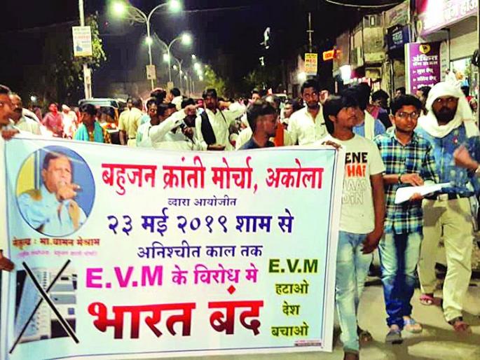 - नीलिमा शिंगणे-जगडअकोला: ‘व्हीव्हीपॅट’च्या कागदी मतपत्रिकांची शंभर टक्के मोजणी करा तसेच निवडणूक आयोगाने तयार केलेले ५६ सी, ५६ डी आणि ४९ एमए हे असंविधानिक नियम रद्द करा, या दोन प्रमुख मागण्यांसाठी बहुजन क्रांती मोर्चाने गुरुवारी ‘भारत बंद’चे आवाहन केले. या आवाहनाला व्यापाऱ्यांनी प्रतिसाद देऊन गुरुवारी सायंकाळी आपली दुकाने काही काळाकरिता बंद ठेवली.मोर्चाचे राष्ट्रीय संयोजक वामन मेश्राम यांच्या निर्देशनात भारत बंदचे आवाहन करण्यात आले होते. अकोल्यातदेखील राजेंद्र इंगोले यांच्या नेतृत्वात अशोक वाटिका येथून आंदोलनाला सुरुवात करण्यात आली. महाराणा प्रताप बागेजवळ सभा घेण्यात आली. या मार्गात येणाºया व्यापारी प्रतिष्ठानांना आंदोलकांनी विनंती करू न दुकान बंद करण्याचे आवाहन केले, तसेच आपल्या मागण्या समजावून सांगितल्या. दुकानदारांनी आपली दुकाने काही काळाकरिता बंद करू न आंदोलनाला प्रतिसाद दिला. अकोल्यात मुख्य शहरासह वाडेगाव, पातूर, बाळापूर येथून आंदोलनाला चांगला प्रतिसाद लाभला.