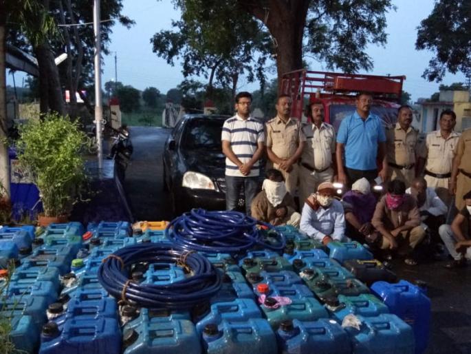 अकोला : गायगाव पेट्रोल डेपोसाठी पेट्रोल घेऊन आलेल्या रेल्वे वॅगनमधून पेट्रोलची चोरी करणाºया टोळीचा उरळ पोलिसांनी बुधवारी पहाटे पारस रेल्वे स्थानकावर पर्दाफाश केला. या टोळीचा गत अनेक वर्षांपासून हा गोरखधंदा सुरु होता. ठाणेदार सतीष पाटील यांनी पदभार स्विकारल्यानंतर पहिलीच मोठी कारवाई करीत पेट्रोल माफीयांना पळता भुई थोडी केली आहे. कारवाईमूळे पेट्रोल चोरणाºया टोळयांचे चांगलेच धाबे दणाणले आहेत.बाळापूर तालुक्यातील पारस रेल्वे स्थानकावर उभ्या असलेल्या रेल्वे वॅगनमधून पेट्रोलची चोरी करण्यात येत असल्याची माहिती उरळचे ठाणेदार सतीष पाटील यांना मिळाली. त्यांनी पथकासह पारस रेल्वे स्टेशन परिसर गाठून या ठिकाणी सापळा रचला, मंगळवारी रात्रीपासून या टोळीवर पाळत ठेवल्यानंतर टोळीतील सहा जन पेट्रोलच्या चोरीसाठी पुढे येताच त्यांना पेट्रोल चोरतांना रंगेहाथ अटक करण्यात आली. या टोळीतील साहेब खान समशेर खान (२७), सुधाकर भिकाजी रणवरे(४८), अक्षय प्रकाश आगरकर (२०), रुपेश रमेश भाकरे (१९), गणेश रामकृष्ण भाकरे (४३), शिवहरी प्रकाश भाकरे (२८) सर्व रा. गायगांव या सहा पेट्रोल चोरटयांना रंगेहाथ अटक केली. त्यांच्याकडून काळ्या रंगाची एम एच ०१ एसी ०५३५ क्रमांकाची दोन लाख ५० हजार रुपयांची कार, कारमध्ये पेट्रोलने भरलेल्या ३० लिटरच्या प्लास्टिकच्या १२ कॅन, ३ रिकाम्या कॅन (किंमत ४० हजार ३२० रुपये) व लाल रंगाची सुमारे एक लाख रुपयांची एम एच ३० बी ०७३२ क्रमांकाची जीप व यामधील पेट्रोलने भरलेल्या प्रत्येकी ३० लिटरच्या ०४ कॅन व ५४ रिकाम्या कॅन, दोन पाईप असा एकूण ४ लाख ४३ हजार सातशे रुपये किमतीचा मुद्देमाल जप्त करण्यात आला आहे. या प्रकरणाची माहिती ठाणेदार सतिश पाटील यांनी भारत पेट्रोलियम गायगांवचे कार्यपालन अधिकारी गोविंदकुमार मुंदडा यांना दिली. मुंदडा यांनी साडेतीन वाजता घटनास्थळ गाठून उरळ पोलीस ठाण्यात तक्रार दिली. यावरुन पोलिसांनी गुन्हे दाखल करून आरोपींना अटक केली आहे. मात्र घटनास्थळावरून तीन आरोपी पळून जाण्यात यशस्वी झाले असून उरळचे ठाणेदार सतीष पाटील त्यांचा शोध घेत आहेत.