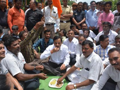 पालकमंत्र्यांच्या घरासमोर ठिय्या देणाऱ्या मराठा समाज आंदोलकांनी दुपारच्यावेळी सोबत आणलेल्या बेसन-भाकरीच्या शिदोºया सोडल्या. यावेळी आंदोलकांनी डॉ. रणजीत पाटील यांनाही बेसण-भाकर खाण्याचा आग्रह केला. त्यांच्या विनंतीला मान देत डॉ. पाटील यांनी आंदोलकांमध्ये बसून त्यांच्यासोबत बेसन-भाकर खाल्ली.