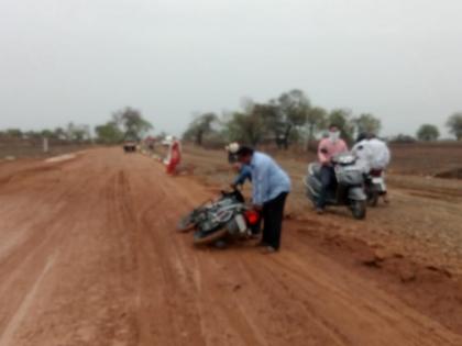 अकोट ते यवतमाळ जिल्ह्यातील हरणी या दरम्यान १६१ ‘ए’ या नव्या राष्ट्रीय महामार्गाच्या रुंदीकरण व सिमेंट काँक्रिटीकरणाचे काम गत काही महिन्यांपासून सुरू आहे. या महामार्गाचा एक भाग असलेल्या अकोला ते अकोट दरम्यानच्या कामाला उन्हाळ्यात सुरुवात करण्यात आली. कंत्राटदार एम. बी. पाटील यांच्या कंपनीने सुकोडा फाट्यापासून उगवा फाट्यापर्यंत रस्त्याचे खोदकाम करून ठेवले आहे. हे काम करताना आधी एका बाजूचा रस्ता तयार झाल्यानंतरच दुसºया बाजूच्या कामाला हात लावणे अपेक्षित होते; परंतु तसे न करता संपूर्ण रस्ता खोदून काम करण्यात येत आहे. खोदलेल्या मार्गावर मुरुम टाकून दबाई करण्यात आली. या महिन्याच्या सुरुवातीला गत शुक्रवार आणि शनिवारी आलेल्या पावसामुळे या रस्त्यावर चिखल साचून वाहतूक ठप्प झाली होती. त्यानंतर शुक्रवार, ८ जून रोजी रात्री झालेल्या जोरदार पावसामुळे शनिवारी सकाळी या मार्गावरील पाचमोरी वीज उपकेंद्र ते उगवा फाटा दरम्यानच्या भागात प्रचंड चिखल साचलेला होता. या मार्गावरून जाताना वाहनचालकांना विशेषत: दुचाकीस्वारांना जीव मुठीत धरून जावे लागत होते. चिखलामुळे काही दुचाकीस्वार रस्त्याने पडल्याने किरकोळ जखमी झाले.