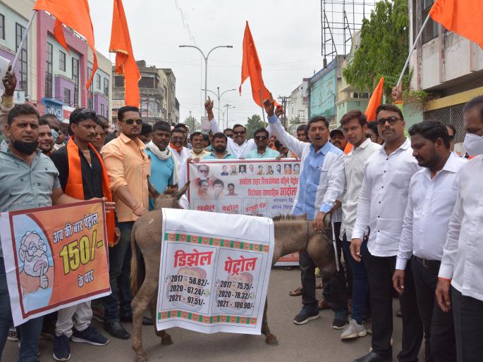 अकाेला: पेट्राेल,डिजेल व घरगुती गॅसच्या दरवाढीमुळे सर्वसामान्य नागरिकांचे कंबरडे माेडल्याचा आराेप करीत शिवसेनेचे शहर प्रमुख राजेश मिश्रा यांच्या नेतृत्वात साेमवारी गाढवावरुन केंद्रीय पेट्राेलिअम मंत्री धर्मेंद्र प्रधान यांची प्रतिकात्मक धिंड काढण्यात आली. खुले नाट्यगृहापासून गांधी चाैकापर्यंत बैलगाडीत दुचाकी आणन्यात आल्या. यावेळी केंद्र शासनाविराेधात जाेरदार घाेषणाबाजी करण्यात आली.