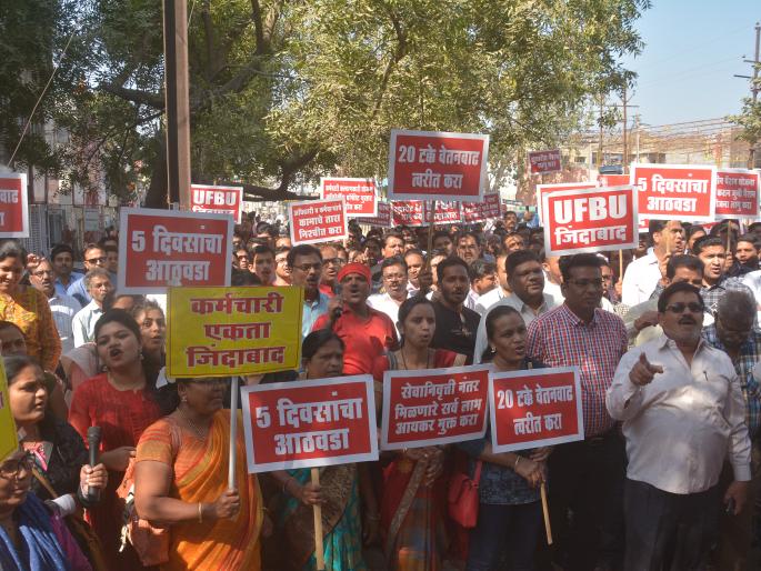 अकोला : युनायटेड फोरम आॅफ बँक युनियन्सने शुक्रवारी आपल्या प्रलंबित मागण्यांसाठी नारेबाजी करीत गांधी मार्गावरील महाराष्ट्र बँकेसमोर धरणे दिले. नवीन पेन्शन योजना बंद करणे, अधिकारी कर्मचाऱ्यांच्या कामांचे तास निश्चित करणे, ५ दिवसांचा आठवडा लागू करणे, आदी मागण्यांसाठी हे आंदोलन छेडण्यात आले.युनायटेड फोरम आॅफ बँक युनियन्स (एआबीईए-एनसीबीई-आयबीक-एआयबीओए-बेफी-ईन्वीक-ईन्वेफ-एनओबीडब्ल्यू-नीबी) शंभर बँक कर्मचारी तसेच अधिकारी म्हणजे १० लाख बँक कर्मचाऱ्यांचे प्रतिनिधित्व करणाºया फोरमच्या वतीने ३१ जानेवारी आणि १ फेब्रुवारी रोजी दोन दिवसीय देशव्यापी आंदोलन पुकारले. या आंदोलनास प्रतिसाद देत अकोल्यातील बँक अधिकारी, कर्मचाºयांनी गांधी मार्गावर निदर्शने केलीत. सकाळी ११ वाजतापासून तर दुपारी ३ वाजतापर्यंत हे आंदोलन चालले. श्याम माईदकर, दीपक पिटके, प्रकाश दाते, गजानन पवार यांच्या नेतृत्वात अकोल्यात आंदोलन करण्यात आले. आंदोलनाच्या यशस्वीतेसाठी युनायटेड फोरम आॅफ बँक युनियन्सच्या पदाधिकाºयांनी परिश्रम घेतलेत. दोन दिवसीय आंदोलनात अकोल्यातील राष्ट्रीयीकृत सर्व बँका सहभागी असतील, अशी माहितीदेखील येथे देण्यात आली.