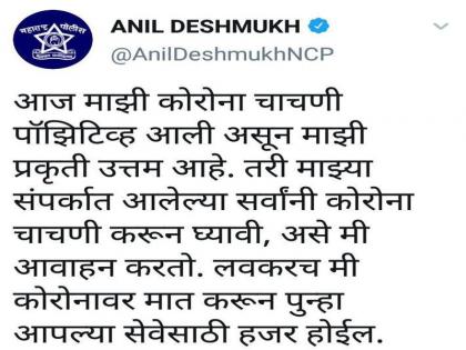 दरम्यान, संपर्कात आलेल्या सर्वांनीच कोरोना चाचणी करण्याचे आवाहन गृहमंत्र्यांनी केले आहे. प्रकृती उत्तम असून लवकरच कोरानावर मात करून जनसेवेत रुजू होणार असल्याचे ट्विट अनिल देशमुख यांनी केले आहे.