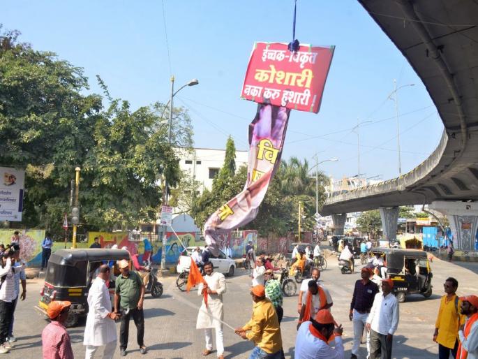 भाजप नेत्यांनो विकृत इच्चक कोश्यारी यालाही गुजरातला घेऊन जा, अशा आशयाचे बॅनरसुद्धा लावण्यात आले. तर, उड्डानपुलाला राज्यपालांचा उलटा प्रतिकात्मक पुतळा लावून चप्पल व लाठ्यांनी बडवण्यात आले. यावेळी राज्यपाल कोश्यारींविरोधात जोरदार अशा घोषणाबाजीसुद्धा देण्यात आल्या.