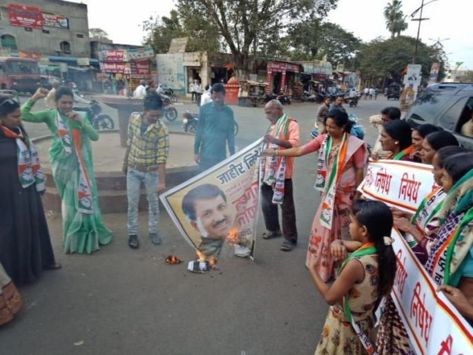 परतवाडा (अमरावती) - भाजपाचे माजी मंत्री बबनराव लोणीकर यांनी महिला शेतकरी व तहसीलदारांचा अपमान केल्याचा निषेध करीत राष्ट्रवादी काँग्रेसच्या महिला पदाधिकाऱ्यांनी स्थानिक जयस्तंभ चौक येथे लोणीकर यांचे पोस्टर जाळले. राष्ट्रवादी महिला जिल्हाध्यक्ष संगीता ठाकरे यांच्या नेतृत्वात हे आंदोलन दुपारी तीन वाजता करण्यात आले.