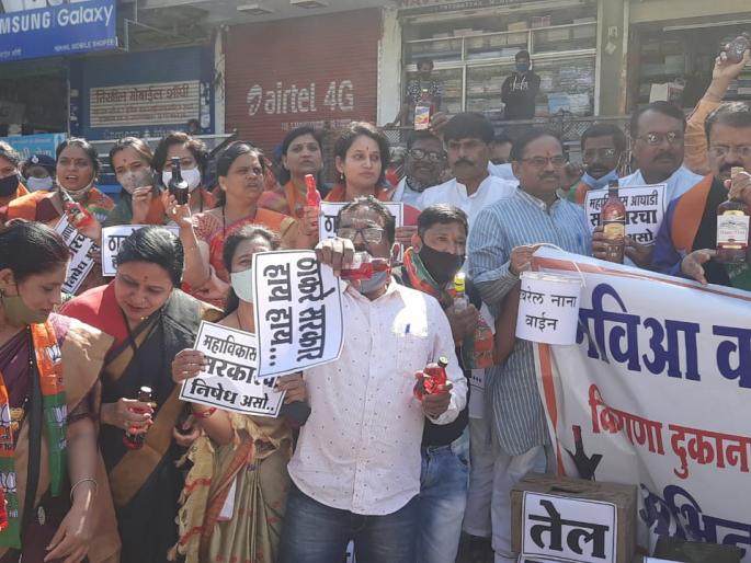 आज सकाळी अमरावतीतील राजकमल चौकात भाजपतर्फे महाविकास आघाडीसरकारच्या विरोधात जोरदार घोषणाबाजी करण्यात आली. तसेच, प्रतिकात्मक किराणा दुकान लावून त्यात वाईन विक्री करण्यात आली. महाराष्ट्राला मद्यराष्ट्र ठाकरे सरकार करत असल्याचा आरोप भाजपने केला, त्यामुळे मद्यविक्री निर्णयाचा विरोध केला जातोय. यावेळी ठाकरे सरकार विरोधात जोरदार घोषणाबाजी केल्यात. यावेळी पोलिसांनी भाजप नेते अनिल बोंडेसह भाजप कार्यकर्त्यांना ताब्यात घेतले.
