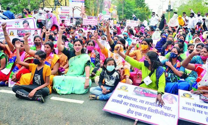 लोकमत न्यूज नेटवर्कअमरावती : गेल्या तीन महिन्यांपासून अक्षरश: दागिने गहाण ठेवून संसाराचा गाडा कसाबसा हाकतोय. पगार नाही. हाताला काम नाही. ज्या एसटीला आमच्या कारभाऱ्याने घाम गाळून जोपासले, त्याच एसटीच्या संपामुळे आपचे हाल होताहेत. विलिनीकरणाची आमची मागणी लगेच मान्य करून आम्हाला न्याय द्या, असा आक्रोश करीत बुधवारी संपात सहभागी एसटी कर्मचाऱ्यांच्या पत्नी, मुलांनी राष्ट्रमाता जिजाऊ यांच्या पुतळ्यासमोर आपल्या भावनांना वाट मोकळी करून दिली. खा. नवनीत राणा यांच्यासमवेत त्यांनी जिल्हाधिकारी नवनीत कौर यांना निवेदन दिले.सकाळी १० पासून जिजाऊ चौकात मोठ्या संख्येने महिला, लहान मुलांची गर्दी जमायला सुरुवात झाली. मागण्यांचे फलक घेऊन चिमुकली मुले या निदर्शनात सहभागी झाली होती. आजतागायत ७० हून अधिक एसटी कर्मचाऱ्यांनी आत्महत्येचा मार्ग पत्करला आहे. मुलांच्या शिक्षणाचा मोठा प्रश्न उभा ठाकला असून कोणतेही सहकार्य मिळत नाही. त्यामुळे आता शासनानेच पुढाकार घेत आम्हाला न्याय द्यावा, अशी आर्त हाक या महिलांनी दिली. आणखी किती मृत्यू बघणार, असा सवालही शासनाला यावेळी विचारण्यात आला.