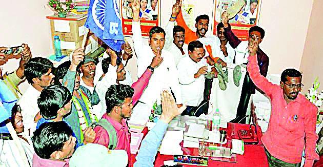 संप्तत रिपब्लिकन पार्टीच्या कार्यकर्त्यांनी मंगळवारी सहायक कामगार आयुक्तांच्या अनुपस्थितीमुळे खुर्चीला चपलांचा हार घातला.
