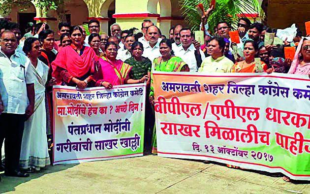 भाजप सरकारने शेतकºयांना अद्यापही कर्जमाफीचा लाभ दिला नाही. अशातच वाढत्या महागाईमुळे गोरगरीब नागरीकांचे जगणे कठीण झाले आहे. परिणामीे जनतेत संताप व्यक्त होत आहे. त्यामुळे हा निर्णय त्वरीत मागे घेण्यात यावा, अशी मागणी काँग्रेसने केली आहे. सध्या राज्यभरातील ४५ लाख कुटुंबांना रेशन दुकानातून मिळणारी साखर बंद केली आहे. परिणामी या निर्णयाचा फटका जिल्ह्यातील ३ लाखांवर एपीएल, बीपीएल कार्डधारकांना बसला आहे. प्रत्येकी ५ युनिट याप्रमाणे व्यक्तीनुसार महिन्याकाठी १ लाख ८३ हजार २६२ क्विंटल साखर बंद केली आहे. त्यामुळे शासनाने अंत्योदयसह एपीएल, बीपीएल, कार्डधारकांना रेशन दुकानातून पूर्वरत दिवाळीपूर्वी साखर वाटप करावे, काँग्रेस सरकारच्या काळात देशातील गरिबांसाठी सुरू केलेल्या अंत्योदय योजनेत तीन रूपये किलो तांदूळ, २१ रुपये किलो गहू व १ रुपये किलो ज्वारी ही योजना नियमितपणे सुरू करावी, आदी मागण्यांचे निवेदन जिल्हाधिकारी यांच्यामार्फत शासनाकडे पाठविले आहे. यासंदर्भात योग्य कार्यवाही केली जाईल, असे आश्वासन जिल्हाधिकारी अभिति बांगर यांनी दिले. यावेळी विलास इंगोले, बबलू शेखावत, माजी आ. केवलराम काळे, हरीभाऊ मोहोड, पुरूषोत्तम मुंदडा, अभिनंदन पेंढारी, उत्तमराव भैसने, सुरेश स्वर्गे, चंद्रभागा इंगोले, योगिता गिरासे, राहूल येवले, अक्षय भुयार, मनोज भेले, अनिल माधोगडीया, मिर साजीद अली, भैय्यासाहेब निचळ, बी.आर. देशमुख, नाना सोनी, वंदना कंगाले, देवायनी कुर्वे, संजय वाघ, साहेबराव घोगरे आदी पदाधिकारी उपस्थित होते.
