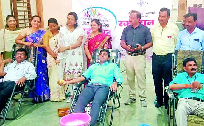 लोकमत न्यूज नेटवर्कअमरावती : अधिकारी, कर्मचाऱ्यांच्या जिल्हास्तरीय क्रीडा महोत्सवात शनिवारी ६१ रक्तदात्यांनी रक्तदान करून सामाजिक बांधीलकी जोपासली.अधिकारी, कर्मचारी क्रीडा महोत्सवानिमित्त रक्तदान शिबिर व आरोग्य तपासणी शिबिर पार पडले. या शिबिरात मुख्य कार्यपालन अधिकारी अमोल येडगे यांनी प्रथम नोंदणी करून सर्व कर्मचारी, अधिकाऱ्यांनी रक्तदान करण्याचे आवाहन करण्यात आले होते. त्यांच्या आवाहनाला प्रतिसाद देत ६१ रक्तदात्यांनी रक्तदान केले. यासाठी सामान्य रुगण्यालय व जिल्हा स्त्री रुग्णालयाच्या सहकार्य लाभले. यावेळी जिल्हा सामान्य रुग्णालयाचे डॉ. आशिष वाघमारे, डॉ. श्रीकांत झाकर्डे, संजय चौधरी, इर्विनच्या साधना शिरसाट, प्रीती तिखे, नितीन बोरकर, राहुल मेश्राम आदींनी सहभाग घेतला होता. रक्तदान शिबिरात ६१ कर्मचारी, अधिकारी यांनी रक्तदान केले. यात १४ महिलाचा सहभाग होता. गरजू रुग्णांना याची मदत होणार आहे. सामाजिक बांधीलकी म्हणून हा उपक्रम दरवर्षी क्रीडा महोत्सवात आयोजित केला जातो. ही कल्पना सीईओ अमोल येडगे यांनी मांडली होती. ती प्रत्यक्ष आणली. यावेळी त्यांनीसुद्धा रक्तदान केले. रक्तदाते मनीष काळे, दत्तप्रसाद भेले, संदीप आकोलकर, संजय राठी, उज्ज्वल पंचवटे, विजया धंदर, नावेद इकबाल, किशोर गुजर, सरिता काठोळे, संतोष मनवरे, डेहनकर, संतोष घुगे, श्रीकांत खाजोने, नावेद इकबाल, विकास रेखाते, मंगेश ठाकरे, प्रविण ढोके, गजानन सानप, प्रकाश देशमुख, अमोल शेंबे आदींचा सहभाग होता.